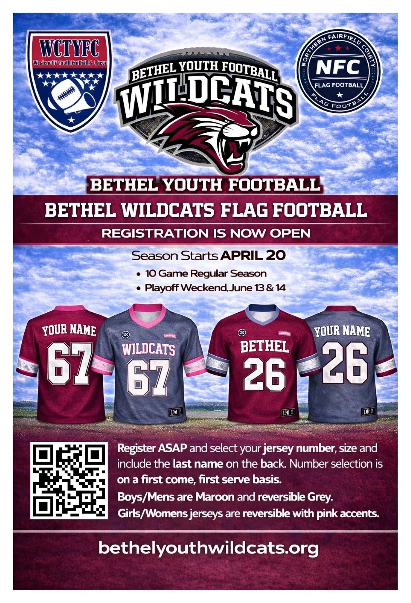 Bethel Youth Football and Competitive Cheerleading is a member of Western CT AYF/AYC. BYF&CC was established in 1968 and provides youth football and competitive cheerleading to the youth of Bethel and surrounding towns. From ages 5 to 14 years old, BYF&CC teaches life skills through football and cheerleading both on and off the field.